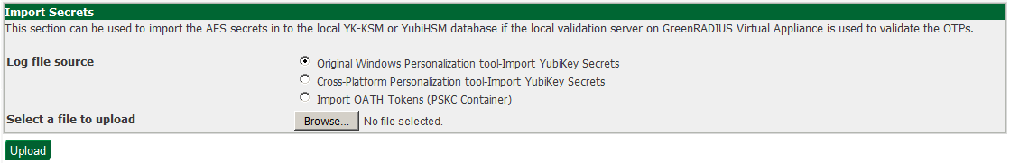 For additional security, YubiKeys can be programmed so new token secrets are generated. Using the Yubico Personalization Tool, YubiKeys can be programmed easily by simply inserting each YubiKey into a USB port. Once the YubiKeys are programmed, the Yubico Personalization Tool creates a CSV file of the token secrets which are then uploaded into GreenRADIUS.